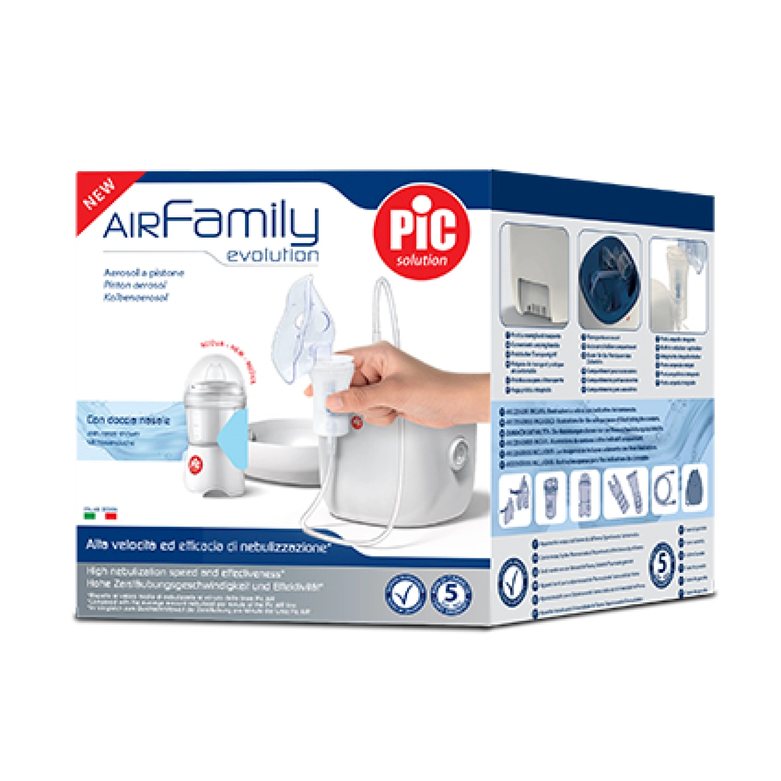 A proposito di accessori: AIRFamily evolution è dotato di pratica doccia nasale* per l’igiene accurata delle alte vie aeree, 2 mascherine per adulto e bambino, forcella nasale, boccaglio, l’esclusiva ampolla Pic Acti-Fast Pro - nebulizza più velocemente per un’aerosolterapia ancora più rapida e mirata** - e il sistema porta-ampolla integrato, che mantiene l’ampolla in equilibrio evitando di rovesciare il farmaco.