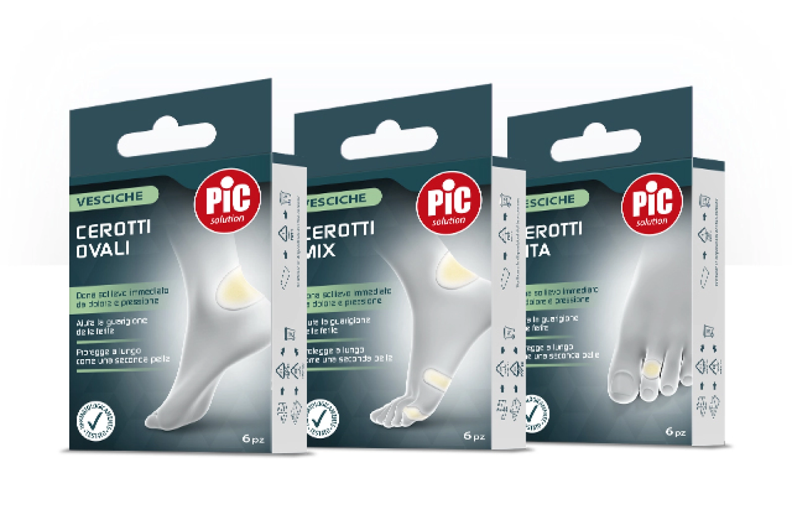 I cerotti per vesciche di Pic presentano uno spessore graduato per donare comfort e rimanere posizionati per diversi giorni come una seconda pelle. I diversi formati sono stati studiati per essere applicati con facilità a seconda delle zone e della dimensione della vescica.