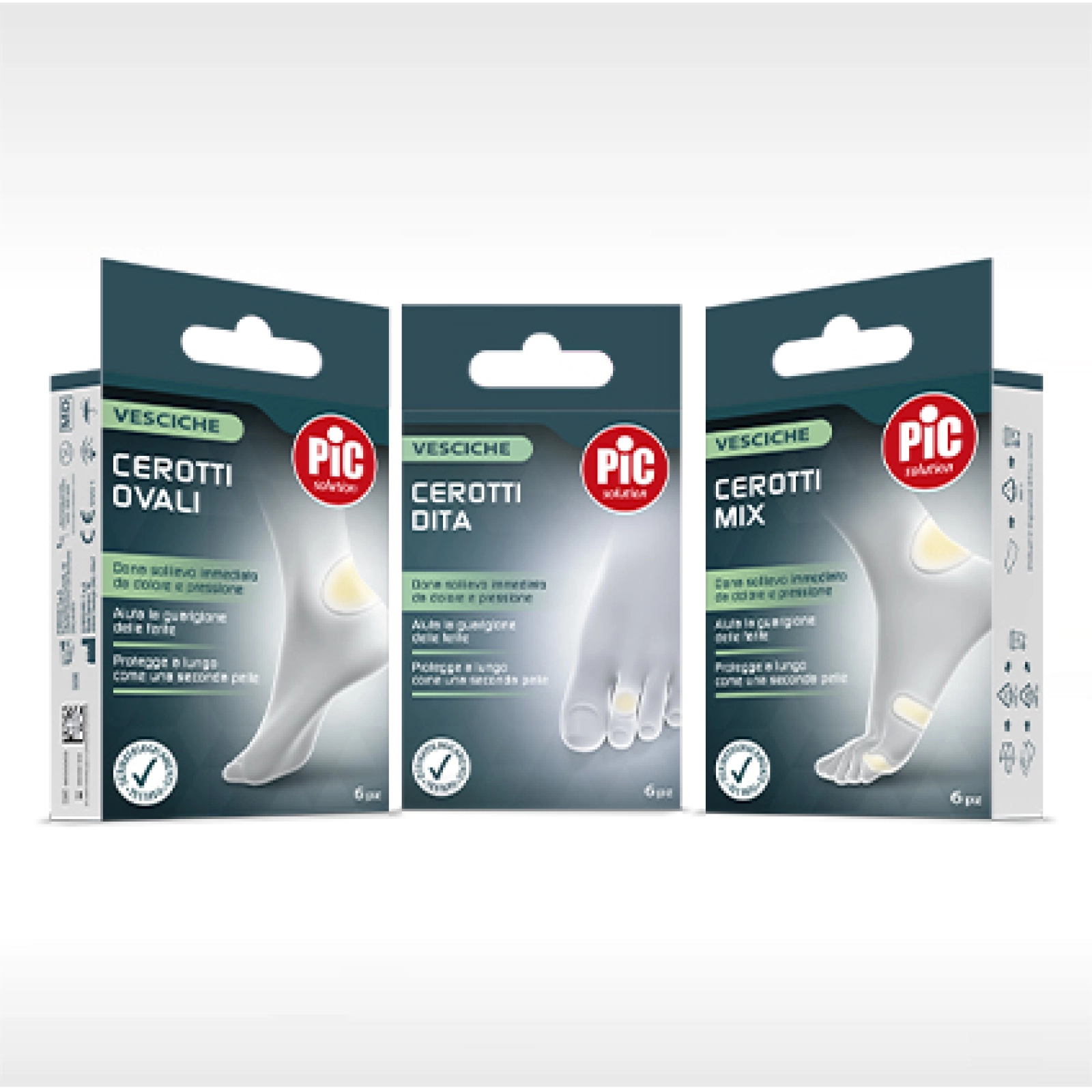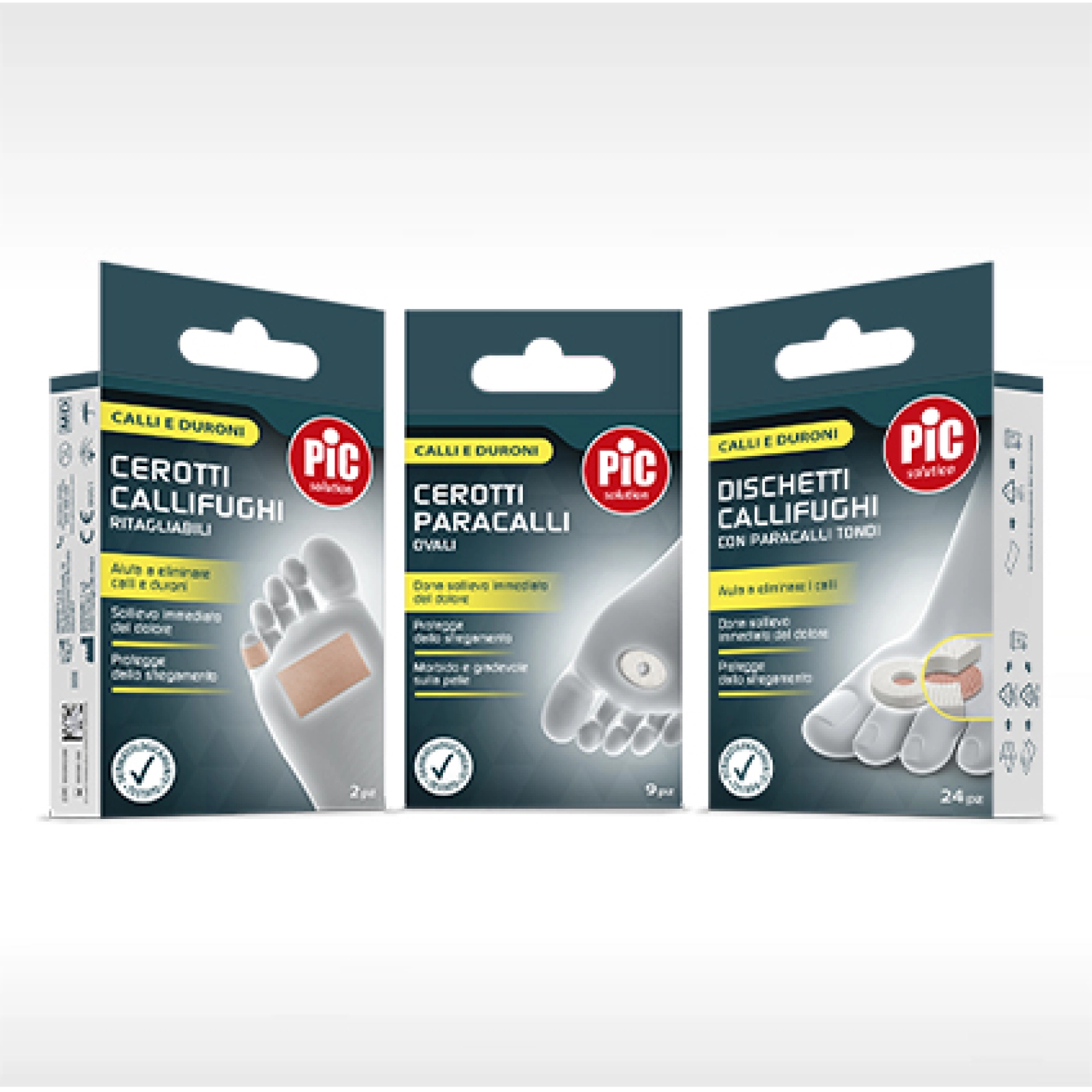 Pic ha creato molti rimedi che agiscono attivamente sui diversi disturbi della pelle del piede, diversificati per tipologia e formati: i cerotti per vesciche disponibili in tre formati (ovali, rettangolari e dita)*, le medicazioni che si prendono cura di calli e duroni suddivise tra cerotti callifughi*, dischetti callifughi*, cerotti paracalli**, il cerotto occlusivo per le verruche* e lo spray crioterapico per verruche***
